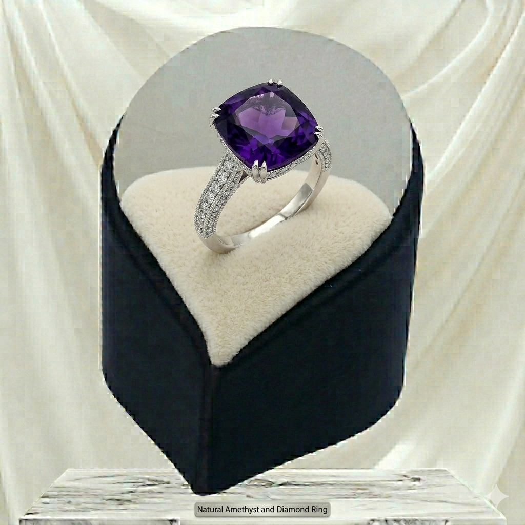 خاتم نسائي من الفضة عيار 925، مرصع بحجر جمشت طبيعي بلون بنفسجي غامق (وزن الحجر 3 قيراط تقريباً)، تصميم يصلح للهدايا والمناسبات.