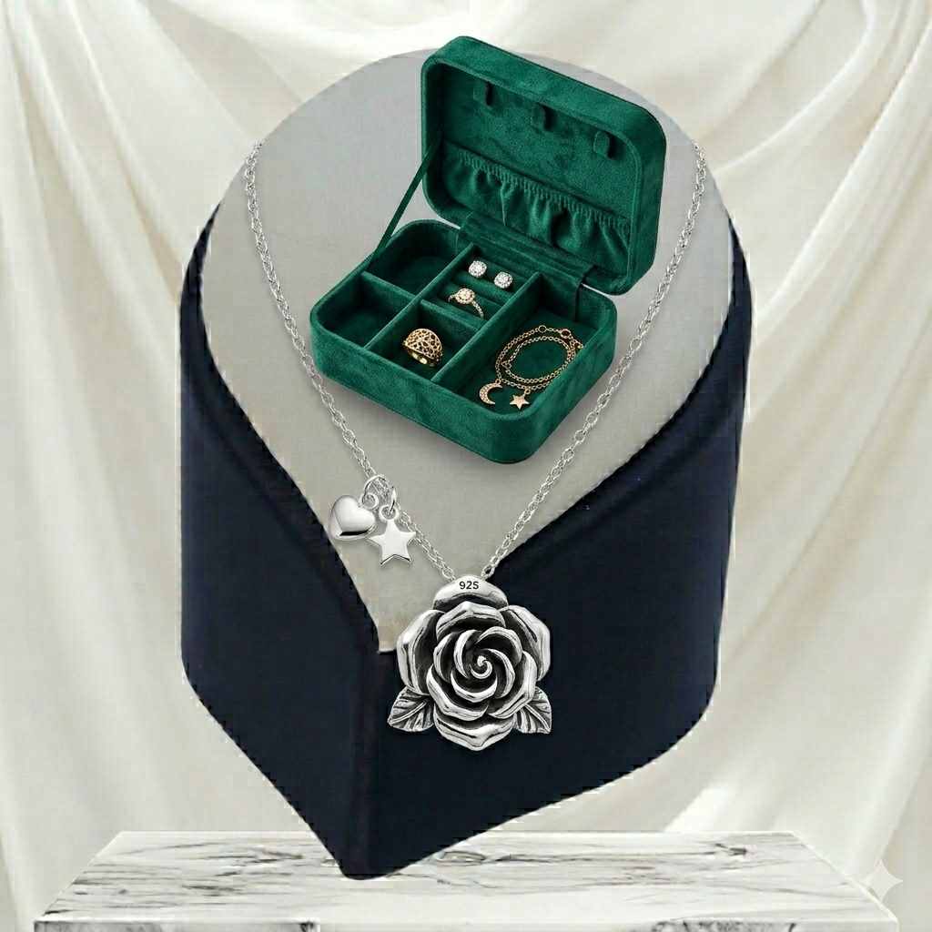 صندوق صغير لحفظ المجوهرات، مصنوع من الجلد المخملي باللون الأسود أو الوردي، يحتوي على طابقين وأماكن مخصصة للخواتم والأقراط.