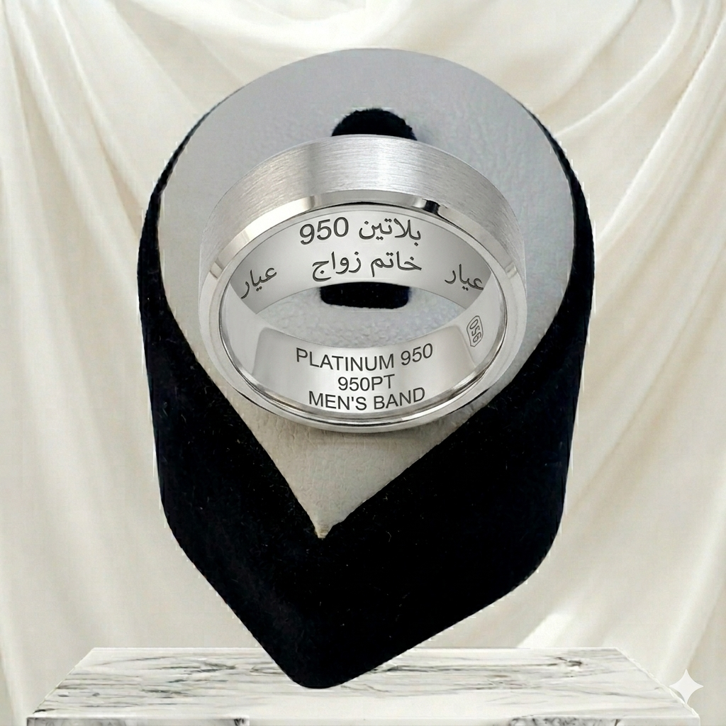 خاتم رجالي كلاسيكي من البلاتين الخالص عيار 950، عرض 4 مم، وزن تقريباً 6 جرام، لون أبيض طبيعي لا يتغير مع الوقت.