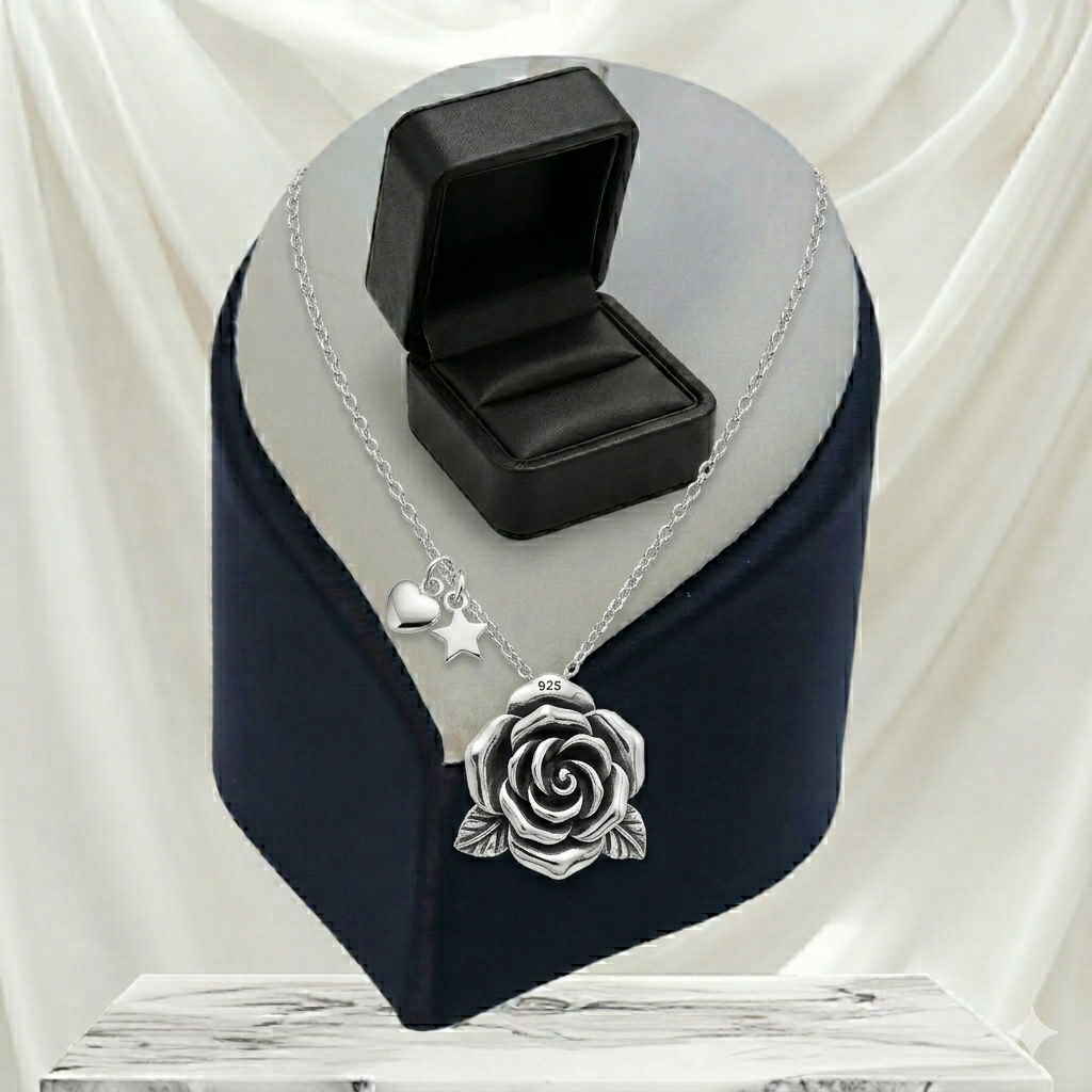 قلادة نسائية من الفضة الإسترليني عيار 925، على شكل زهرة وردة متفتحة، مع سلسلة طول 45 سم، أنيقة وبسيطة.